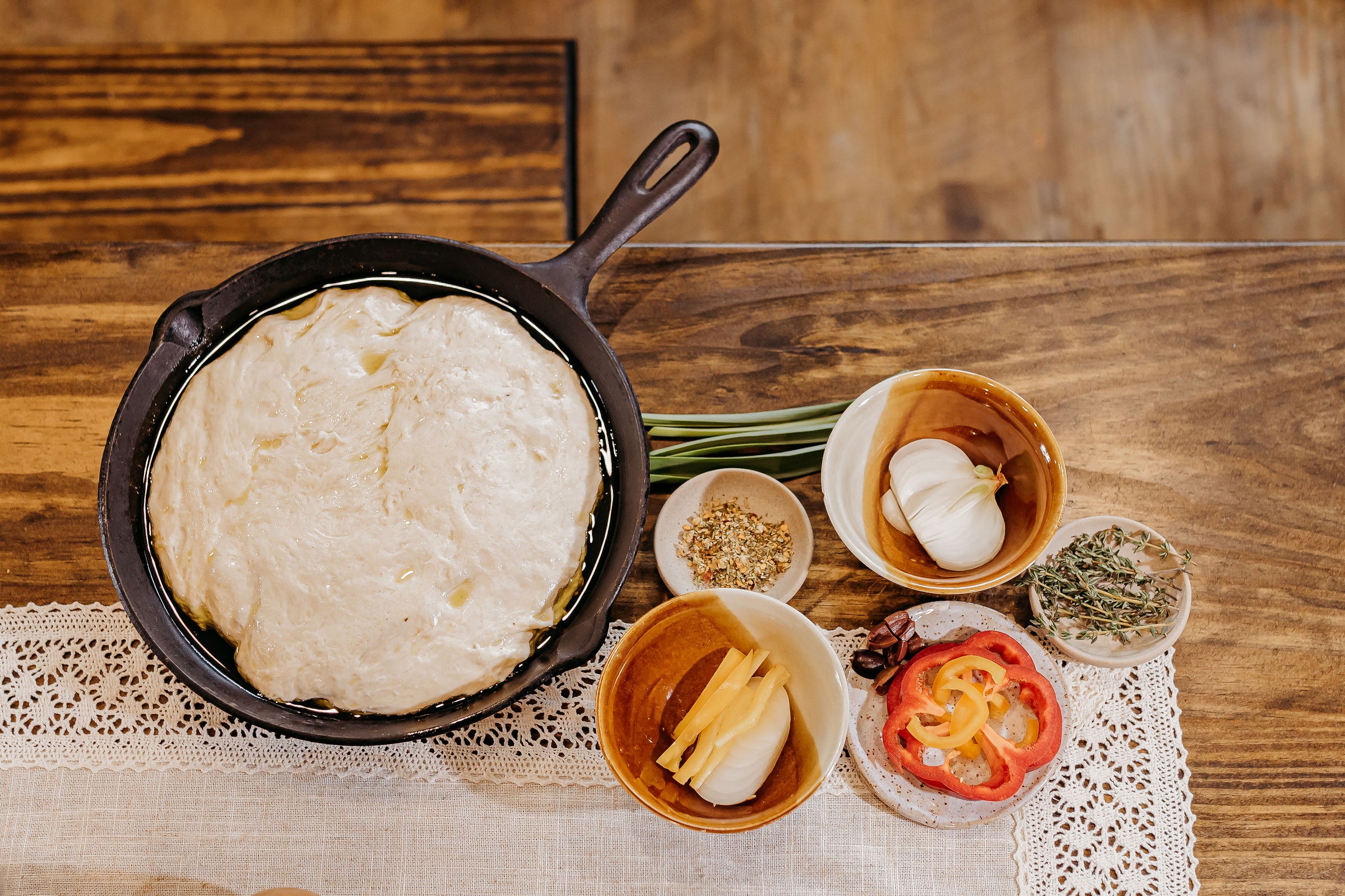 Gently shape the dough into a heart, dimple deeply, and top with olive oil, rosemary, roasted garlic, and flaky salt. This pairs beautifully with pasta and feels special without being fussy.