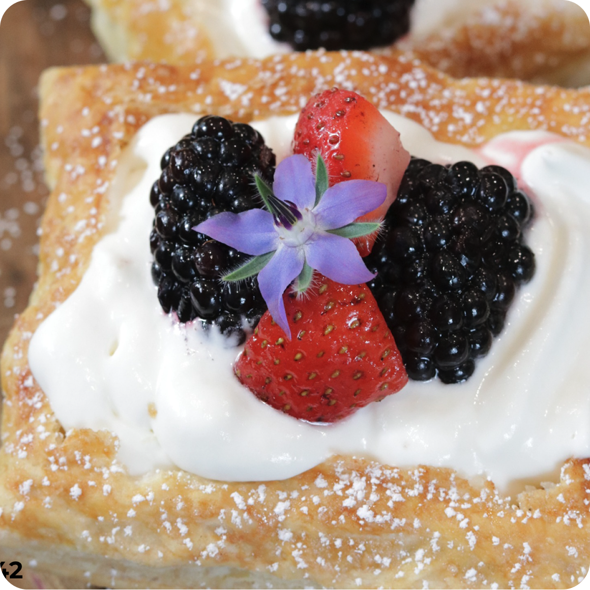 Cinnamon Rolls, Pop Tarts, Blueberry Muffins with Strudel, Cranberry Lemon Loaf, Coffee Cake, Scones, and cozy breakfast pastries.