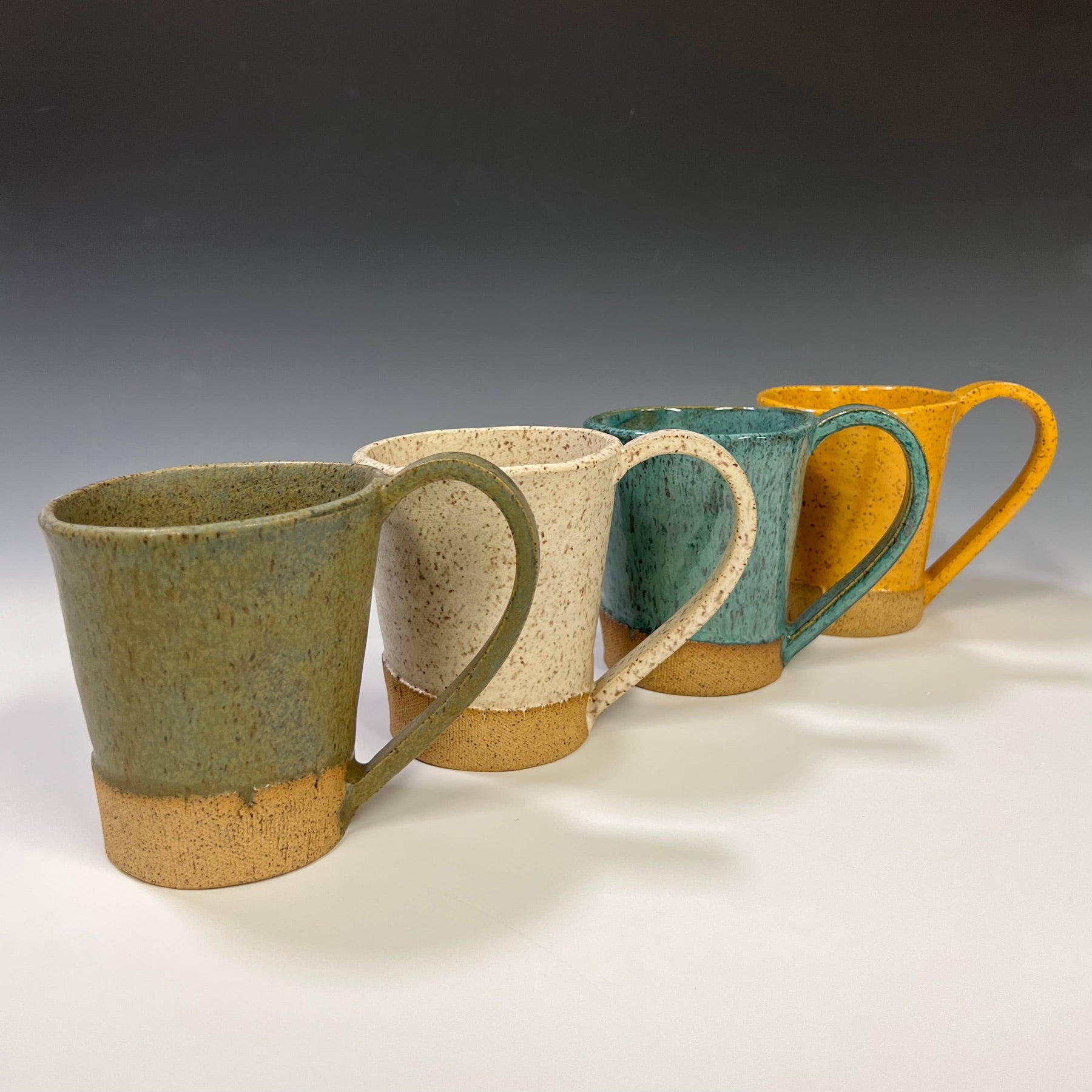 Four ceramic mugs in different colors on a light gray background